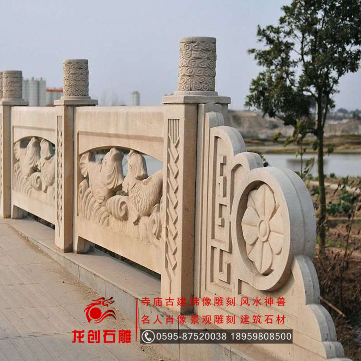 常見石雕欄板以雙魚戲珠為浮雕,賦予了吉祥如意的含義。部分文化景區的石雕欄板也非常有特色,會在上面雕刻大量的歷史故事等題材,這樣一來既美化了景區環境,又起到了防護功能,又起到了解說的作用,可謂是一舉三得。