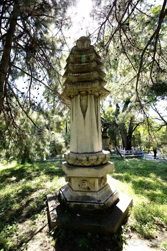 潭柘古剎,歷經了十多個朝代,規模宏大,曾有難以數計的僧人在這里修行,并終老于此,因而在寺院附近留下了數量眾多的僧人墓塔。如今在寺前的塔林內完好的保存著形式多樣的歷代佛塔七十余座。下塔院的塔林埋葬著金、元、明三代的部分高僧,塔形不一,種類較多,有石經幢式塔、方形單層浮層屠式塔、密檐式磚塔和覆缽形藏式石塔。塔林中最高大的墓塔要數金代的廣慧通理禪師塔,此塔位于下塔院的中心,塔高九層,也是密檐式實心磚塔,塔前設有寬大的石供桌,塔前左右兩側還各有一株千年娑羅樹。