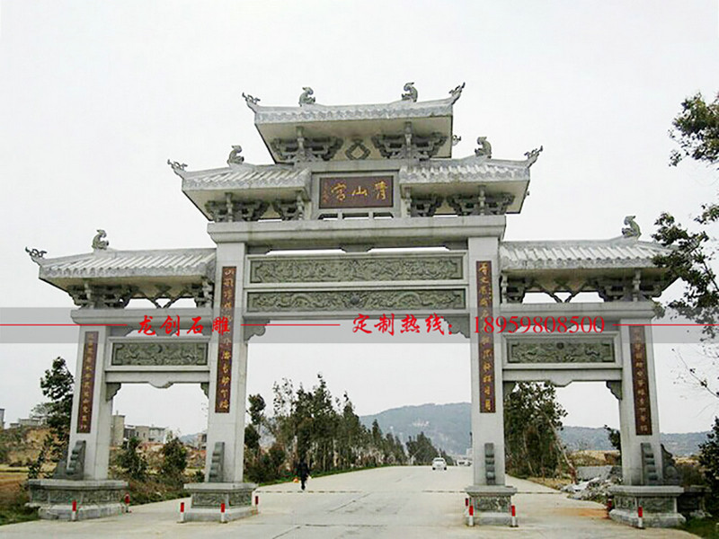 石雕石頭牌坊設計其實要注意的事項很多,首先就要考慮到的就是牌坊的樣式打造。牌坊起源于周朝時期,早期牌坊的設計可以參考石雕漢闕、衡門,也就是兩根柱子和一根橫梁,經漢朝形成了漢闕,發展為欞星門,后來造型基本也就固定下來。牌坊的樣式選擇很多,主要從規格上分,有三門牌坊、五門牌坊以及七門牌坊等等,而要說造型設計,有沖天式或者不出頭式等,在實際雕刻建造的時候都可以先有基本考慮,綜合地域文化來打造,讓牌坊也能夠有更為適宜的搭配。
