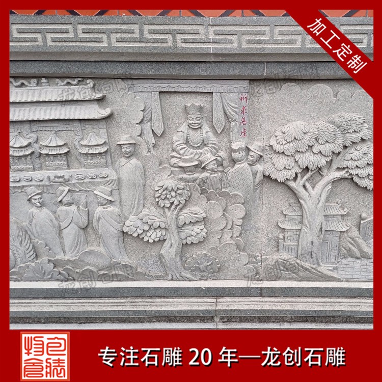 佛教寺院文化墻浮雕所雕刻的內容涵蓋了許多方面,有的是寺院的歷史變革,有的是諸佛菩薩的經典典故,有的則是寺院供奉主佛、菩薩的一些人物故事,這些所謂的典故中必然是佛經中有明確記載的。這種浮雕文化墻一般會采用青石或芝麻黑花崗巖石料,因為這些石材的顏色相對深一些。在雕刻人物形象時,可以清晰地體現出來,包括人物的每一個動作。