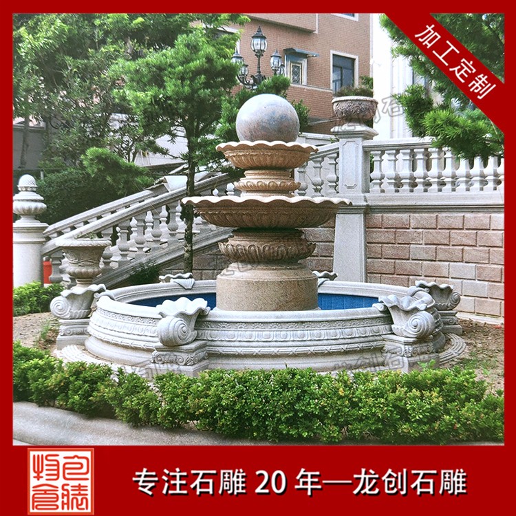 有一種特別的噴泉,上面會帶有一個圓球,叫做石材風水球噴泉,主要特點就是頂部有一個轉動的流水石球,我們稱之為風水球。這類噴泉是比較有中國傳統雕塑特點的。風水球有中國傳統思想中的轉運迎好運的寓意,所以在一些私宅別墅庭院中,常常放置風水球噴泉。福建石材風水球噴泉廠家,選惠安龍創石雕,20年實力廠家,按需加工定制。