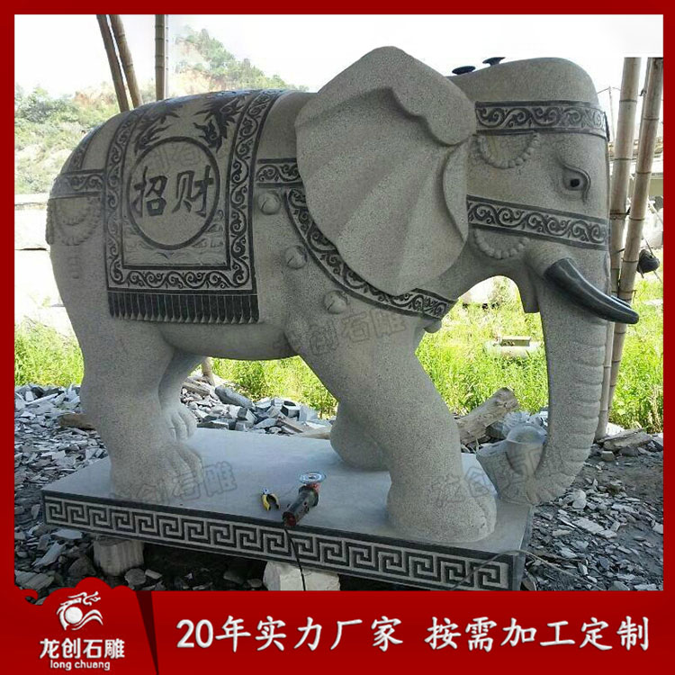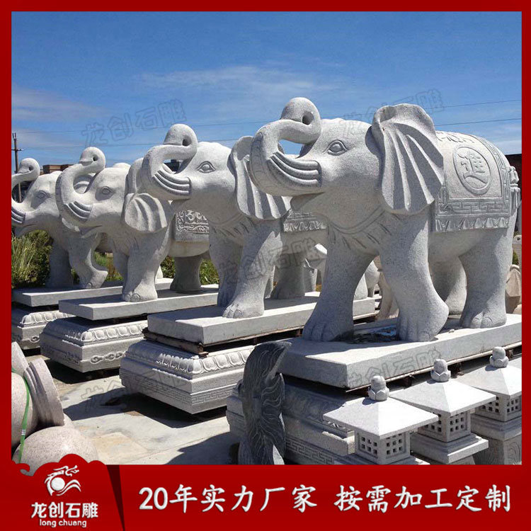 石雕大象造型各異,款式不同,所以我們可以在市面上見到各種形形色色的石雕大象作品。石雕大象在一些大型景區經常看到,例如南京牛首山廣場擺放十二只大小相同,卻形態各異的石雕大象;廈門南普陀寺門口擺放著一對做工精細,雙面雕龍,威猛無比的仿古石雕大象;深圳大鵬東山寺山門腳下則擺放著石獅子、石象各一對,還有一對哼哈二將守護著寺院,并庇佑當地百姓。