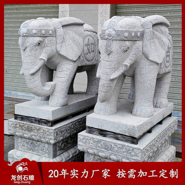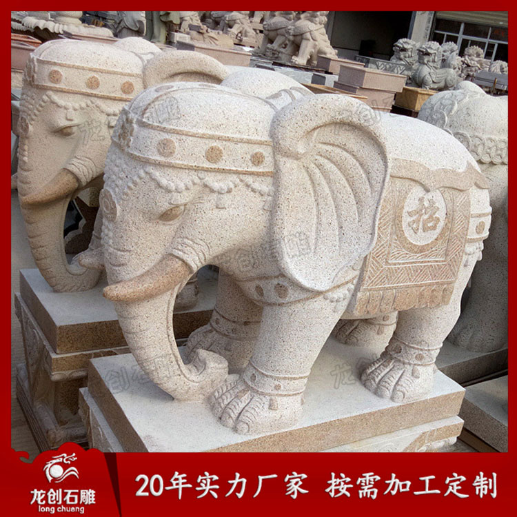 石雕大象造型各異,從鼻子來看,就有分鼻子朝上、鼻子朝下、鼻子朝內、鼻子朝外。象諧“祥”音,所以常有吉象之稱,適合擺放在酒店別墅、企業、寺廟門口等各種場景。
