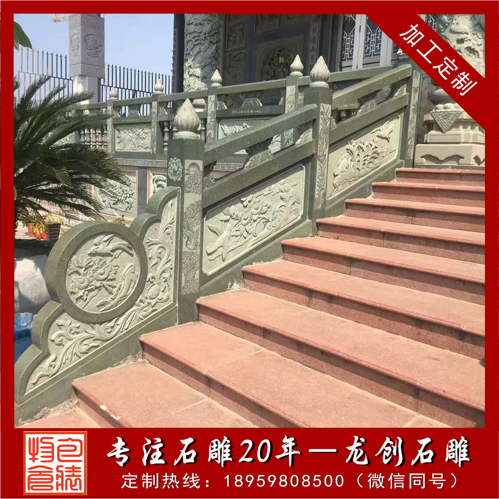 從欄桿的雕刻用料看,普通青石、綠色青石等是比較基礎的雕刻材料,普通青欄桿價格在500-700元左右,根據雕刻建造情況,欄桿的價格也都會有所不同。考慮到現在特殊區域使用需求,也有不少選擇綠色青石欄桿或者綠山巖欄桿,高的話達到1000元以上等等。