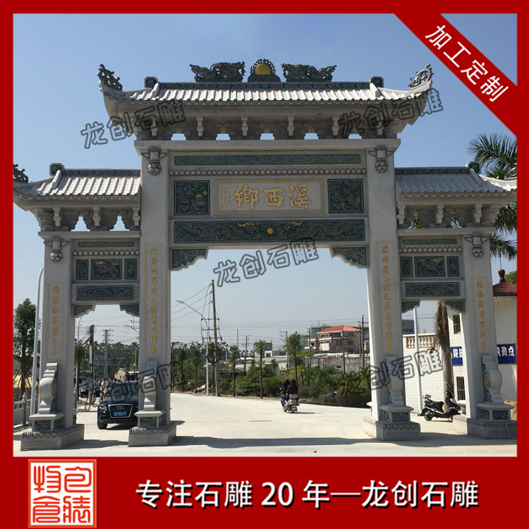 農村大門牌坊定做當然在材質的選擇上都比較講究,為保障牌坊本身的美觀性和牢固性,在材料挑選上也都有非常高的要求。綜合現在牌坊的雕刻看,主要用料有青石、花崗石、大理石等,要說比較合適的牌坊雕刻用料,還是以花崗石為主,花崗石的材質比較堅固,花色也都比較多,能夠雕刻出更為細致的村口牌坊作品。