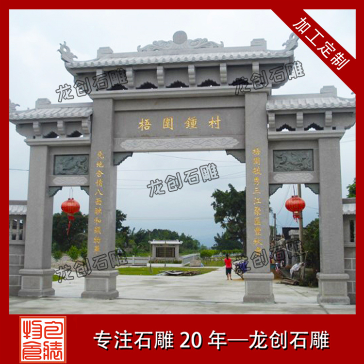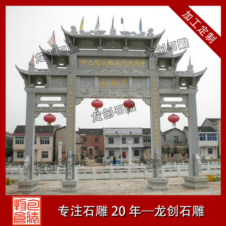 鄉村入口村牌坊的建造不僅是村莊的的一個標志,它還代表著人們美好愿望的一種寄托。首先是石牌樓的建造作為一種標志性的建筑,它用以標明地名,在村子的入口處就能傳遞一種信息。同時石牌樓的安裝也代表著人們生活水平的,因為一座牌樓的價格相對來說還是比較昂貴的,即使單門的石牌樓價格也要幾萬元。