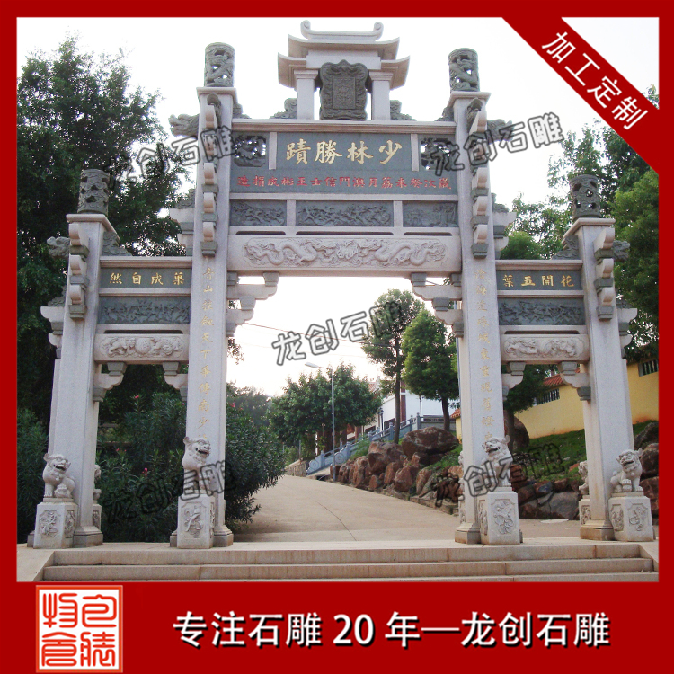 石牌坊廠家提供的高清寺院石牌坊圖片中,寺廟大門牌坊樣式眾多,常見的有一門三樓、三門三樓、三門五樓、三門七樓、五門五樓、九樓等樣式,從這里就能看出寺廟大門牌坊圖片樣式有很多,雕刻工藝精湛,外觀造型雄偉大氣,制作寺廟大門牌坊的材質也越來越多,如青石、大理石、花崗巖、漢白玉、輝綠巖等多種天然石材都是現在制作寺廟大門常用的。